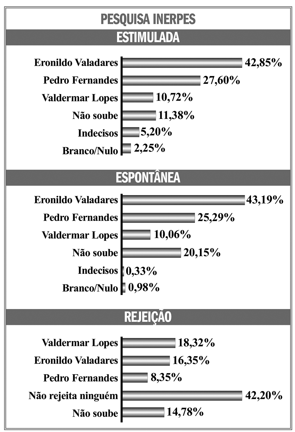 Pesquisa estimulada realizada pelo Instituto Neropolino de Pesquisa (Inerpes) indica vantagem do prefeito Eronildo Valadares (PMDB) na disputa à Prefeitura de Porangatu. Eronildo, que busca a reeleição este ano, aparece com 42,85% das indicações de voto no seu projeto de permanecer por mais quatro anos.