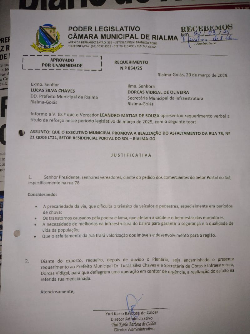 O vereador Leandro Matias de Souza comemorou a execução de mais uma importante obra para a comunidade de Rialma. A pavimentação asfáltica da Rua 78, no Setor Residencial Portal do Sol, foi realizada após o atendimento de um requerimento apresentado pelo parlamentar e aprovado por unanimidade na Câmara Municipal.